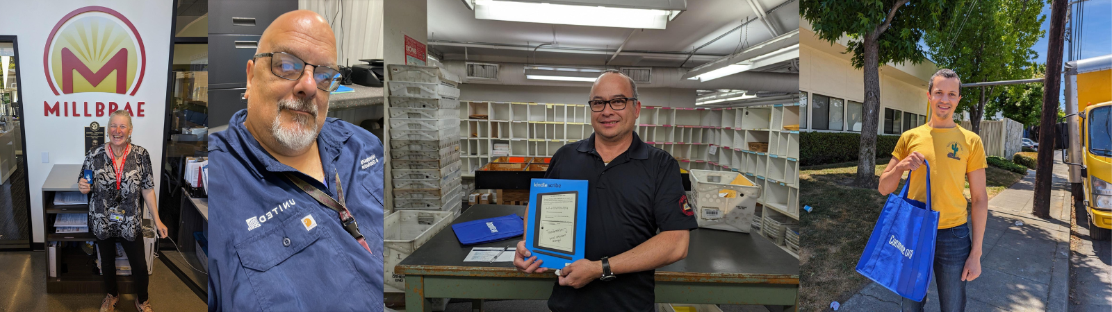 Pictured left to right: Laurette, public transit commuter won a $300 Clipper Card, Perry a vanpool commuter won a vacation package, Allan a carpool commuter won a Kindle Scribe, and George a bicycle commuter won Bose Noise Cancelling Earbuds, Pauline a Shuttle commuter won a $200 e-gift card and shared a quote saying, “The available shuttles are very convenient and I strongly encourage everyone to give them a try.”